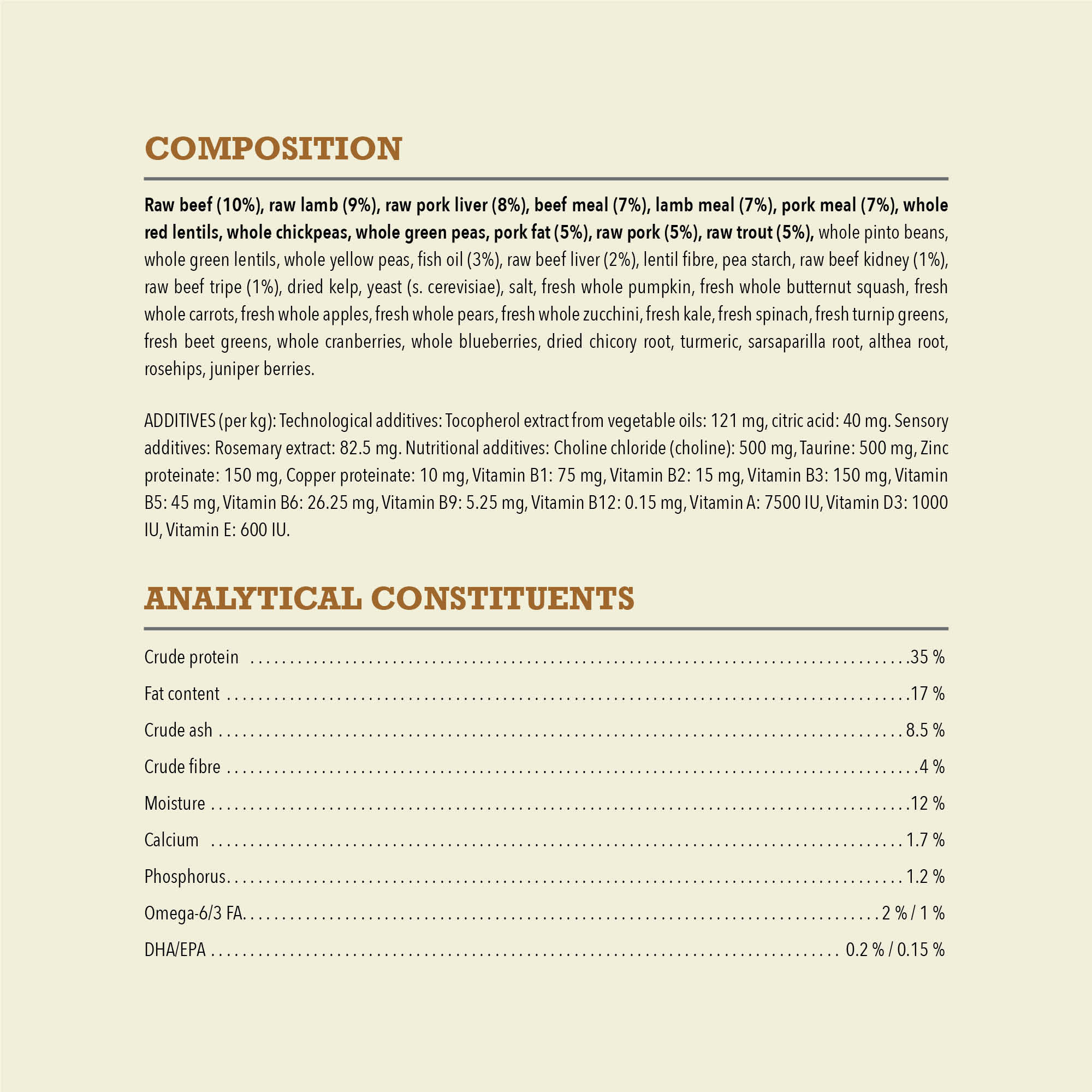 Raw beef (9%), raw lamb (8%), raw pork (8%), beef meal (8%), lamb meal (8%), pork meal (7%), whole green peas, whole red lentils, whole chickpeas, beef fat (5%), raw beef liver (4%), raw pork liver (4%), raw freshwater lake fish* (4%), whole green lentils, whole pinto beans, whole yellow peas, pea starch, raw bison (2%), fish oil (2%), lentil fibre, raw lamb liver (0.5%), raw lamb tripe (0.5%), dried kelp, salt, freeze-dried beef and liver, fresh whole pumpkin, fresh whole butternut squash, fresh whole carrots, fresh whole apples, fresh whole pears, fresh whole zucchini, dried chicory root, fresh kale, fresh spinach, fresh turnip greens, fresh beet greens, whole cranberries, whole blueberries, whole saskatoon berries, turmeric, milk thistle, burdock root, lavender, marshmallow root, rosehips. *varied mix of raw tullibee, whitefish, northern pike, and mullet.